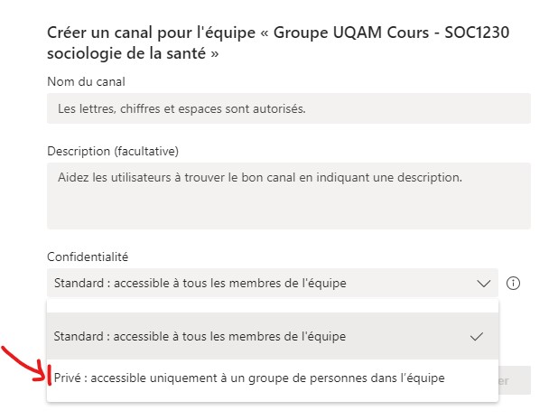 Ensuite, entrer un nom et une description pour le canal et choisissez l’option canal privé sous confidentialité