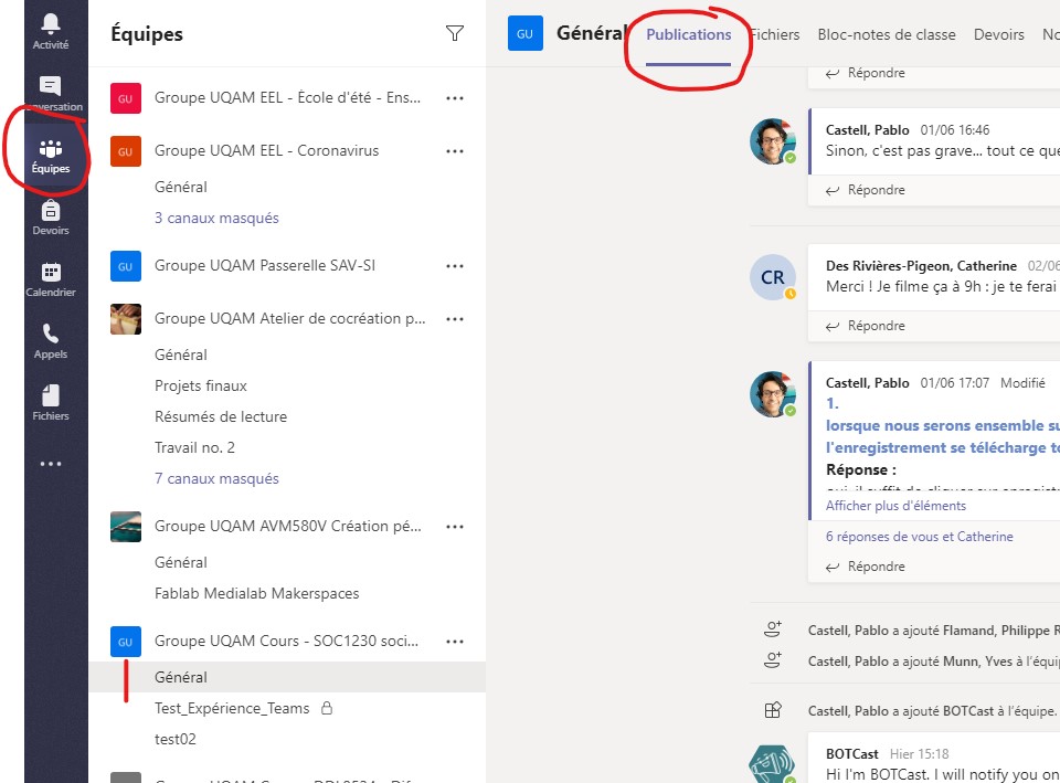 Pour créer un message pour votre classe entière, vous devez cliquer sur le bouton Équipes, puis sélectionner une équipe et un canal. Ensuite, sélectionnez l’onglet Publications.