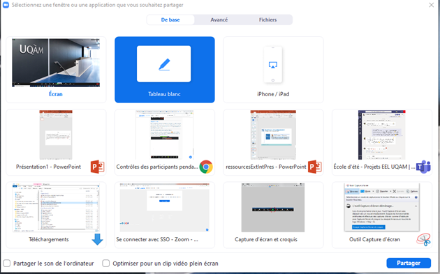 Sélectionner Tableau blanc et cliquer sur le bouton Partager.