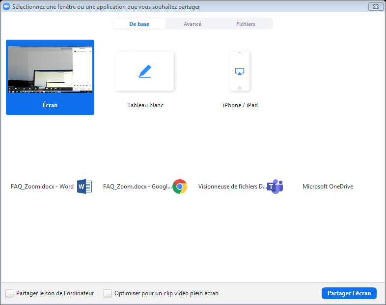 Sélectionnez l’écran ou le document ouvert à partager. Si vous désirez aussi partager du son, cocher la case Partager le son de l’ordinateur en bas de la fenêtre. Finalement, cliquer sur le bouton Partager l’écran. Les participants verront alors le document à leur écran.